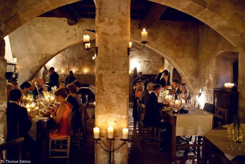 Pour les banquets, la structure dispose d’une salle à manger, répartie sur deux niveaux. Des éléments décoratifs raffinés, des murs en pierre, des plafonds avec poutres apparentes et un éclairage romantique caractérisent ces environnements pouvant accueillir jusqu’à 150 personnes.